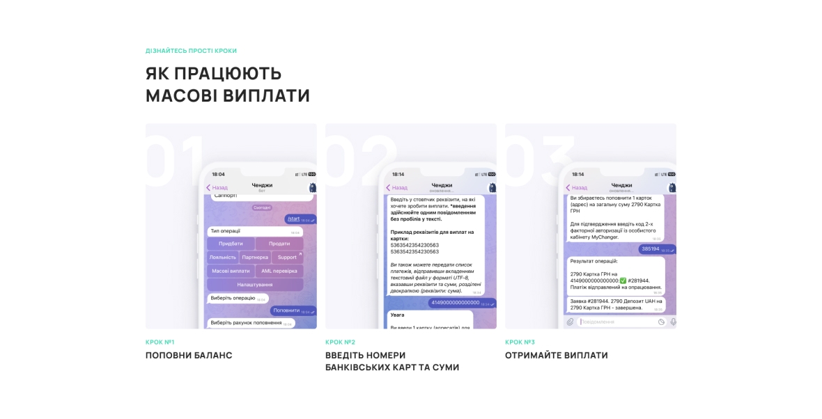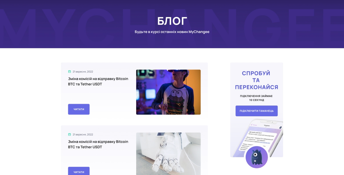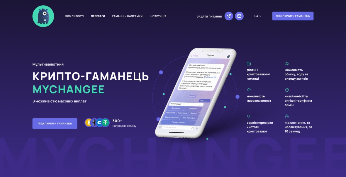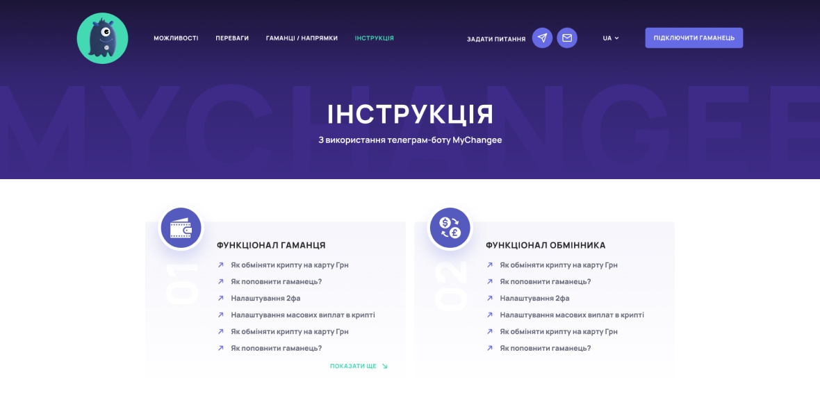 MyChangee is a multi-currency telegram crypto wallet bot with a large number of functions. The customer needed a website that would tell about all its directions, advantages and an accessible explanation of its use. The style of the site was chosen in accordance with the crypto theme