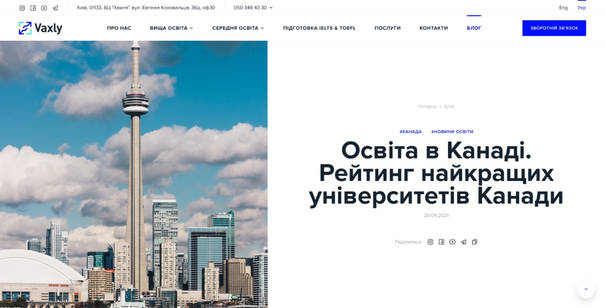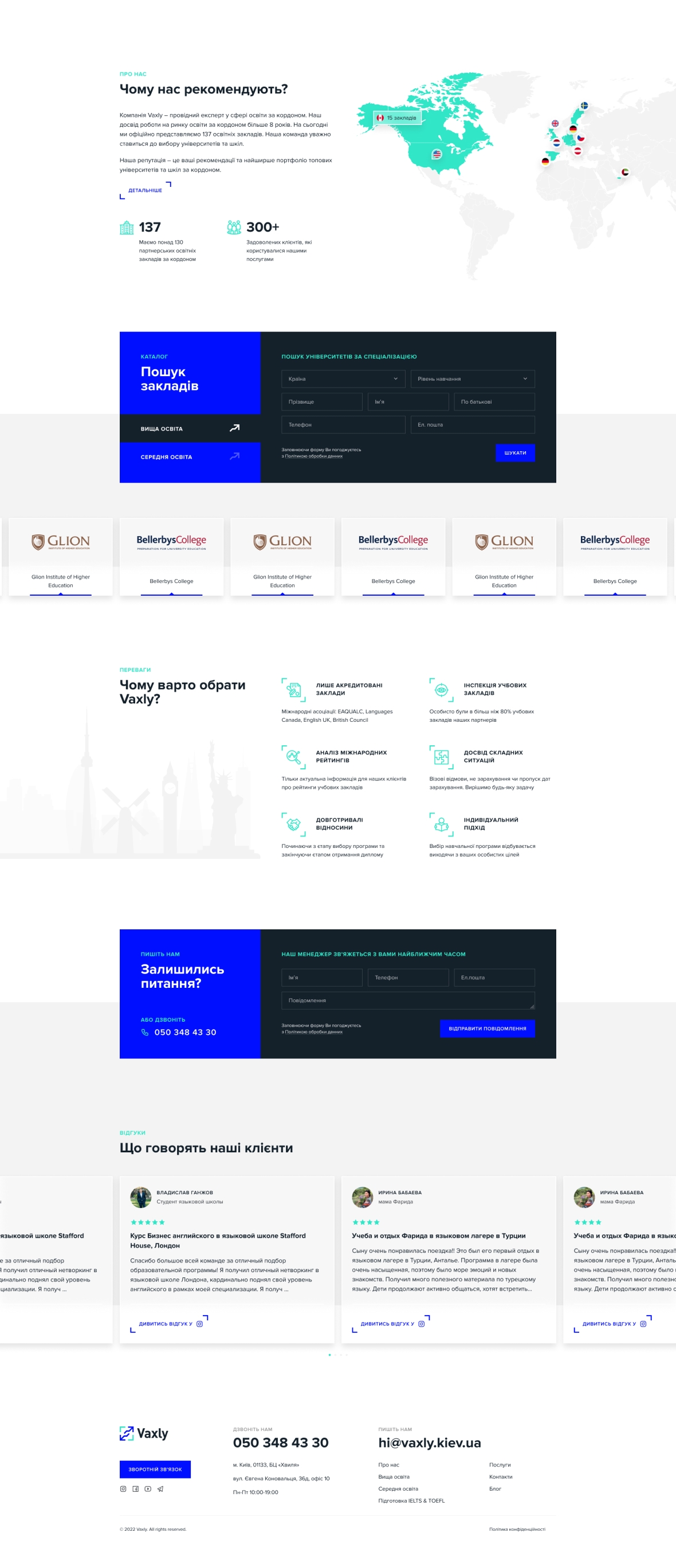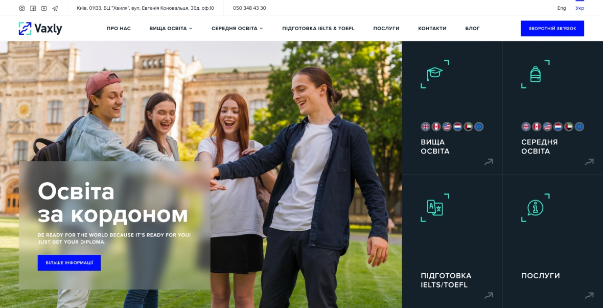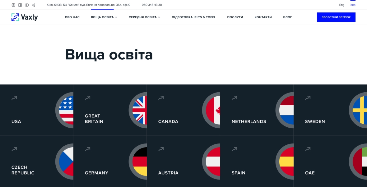 Vaxly is a consultant for education abroad. The company had its own website, but it was outdated. I made an emphasis on the main areas of the company's work and the geography of partner educational institutions